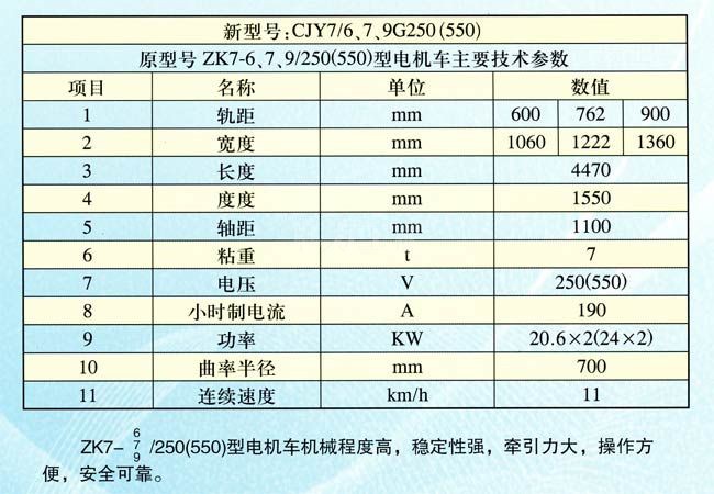 7噸窄軌架線式工礦電機車及7噸雙機牽引機車是我公司推出的新產品,其供電電壓有250V、550V兩種,減速箱為圓錐和圓柱雙級齒輪傳動。7噸電機車具有車身側板厚,剛度好,齒輪使用壽命長,牽引力大,速度快等特點。7噸電機車由于采用V型橡膠減震器,因而緩沖、減震、消噪性能好和小彎道動力通過性能好。